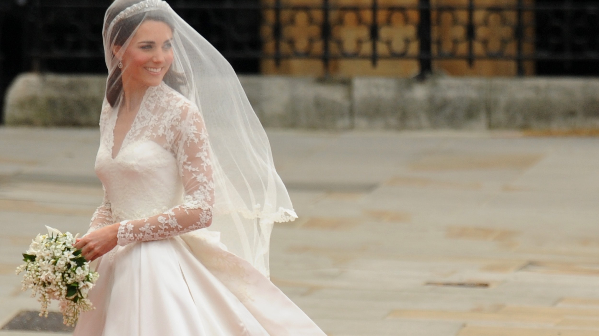Gorset doskonale podkreślał jej szczupłą talię, a długi tren (2,5 metra) dodawały jej szyku księżna kate. Pierwsza suknia ślubna kate została uszyta z ręcznie robionych koronek.